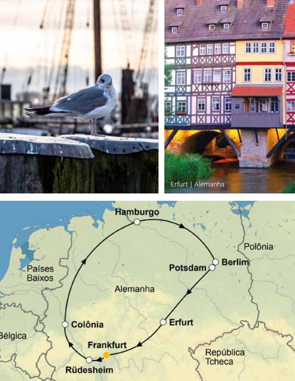 PROMOÇAO 5% OFF válido para vendas fechadas até 30 de abril. Guia acompanhante bilíngue em espanhol e português do 2° ao 7 dia (motorista-guia para grupos com menos de 8 pessoas). 7 dias de viagem passando por Frankfurt, Rüdesheim, St. Goar, Colônia, Hamburgo, Berlim, Frankfurt (sem hospedagem)